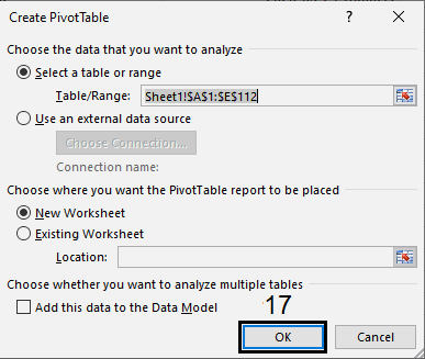 17. Pastikan tabel pada Select a table or range berada menyeleksi tabel hasil export mulai dari label paling atas hingga isi tabel paling bawah seluruhnya, Klik “OK”